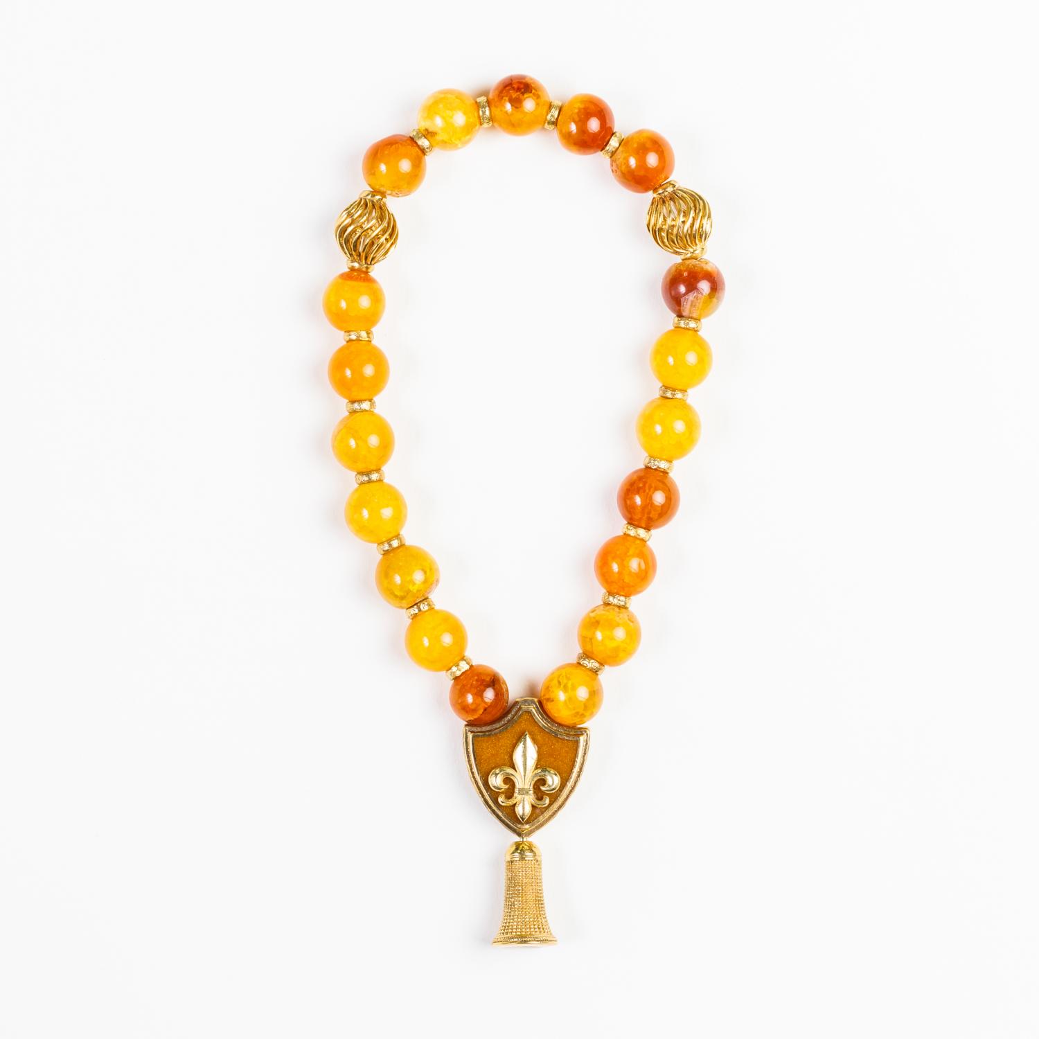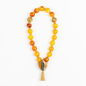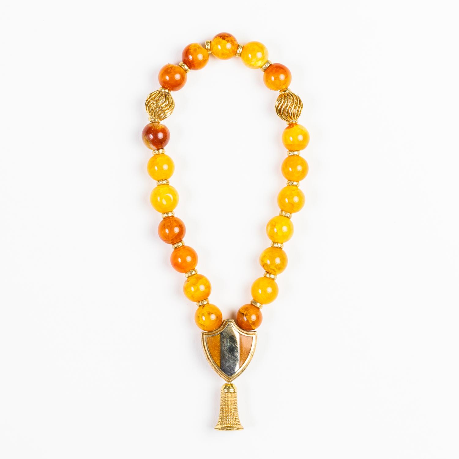 Նյութը՝ ոսկերչական ալոյ, կերամիկական էմալ, բնական քար, ոսկեպատՔաշը՝ 50 գՉափը՝ 160 մմՊատրաստման եղանակը՝ ձեռքի աշխատանք