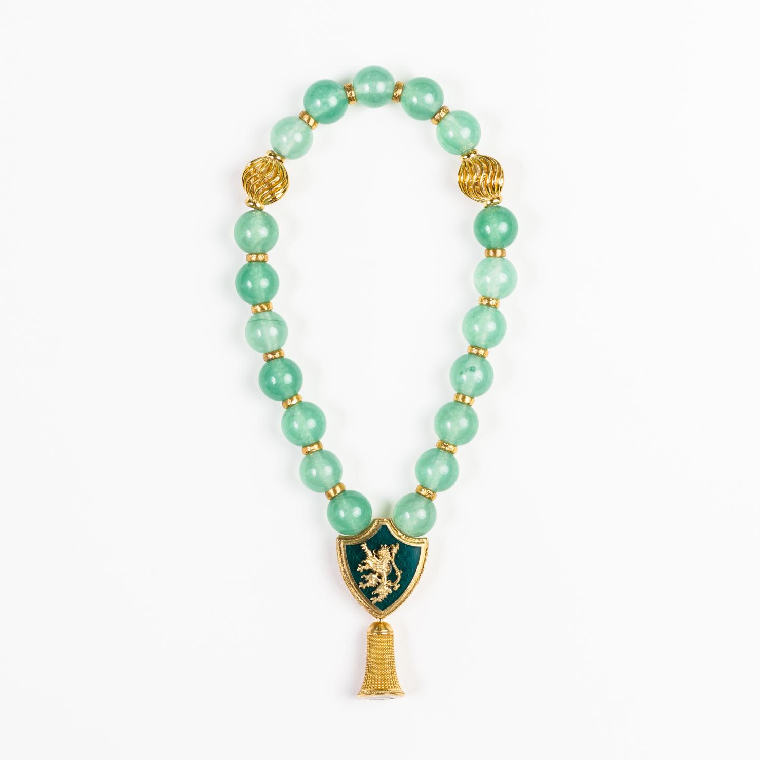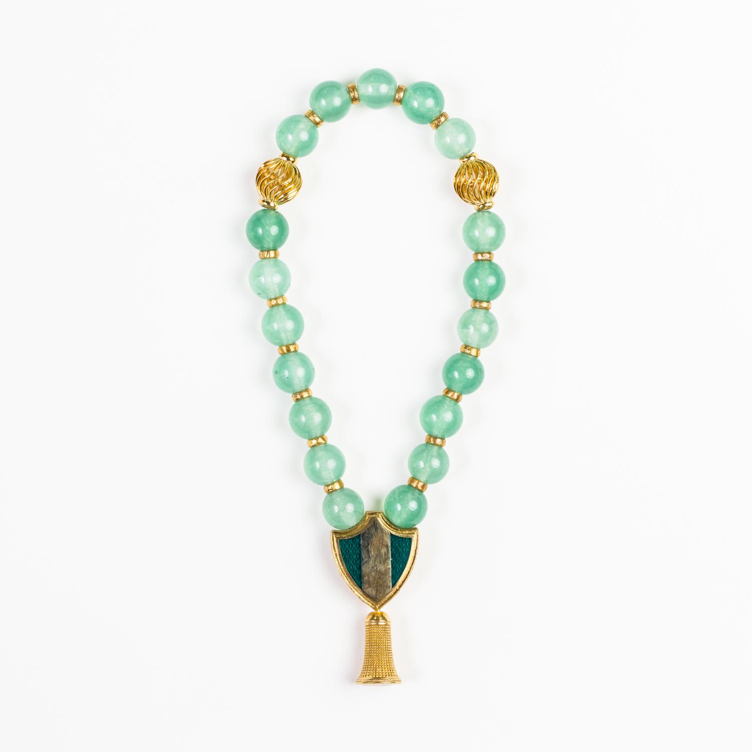 Նյութը՝ ոսկերչական ալոյ, կերամիկական էմալ, բնական քար, ոսկեպատՔաշը՝ 50 գՉափը՝ 160 մմՊատրաստման եղանակը՝ ձեռքի աշխատանք