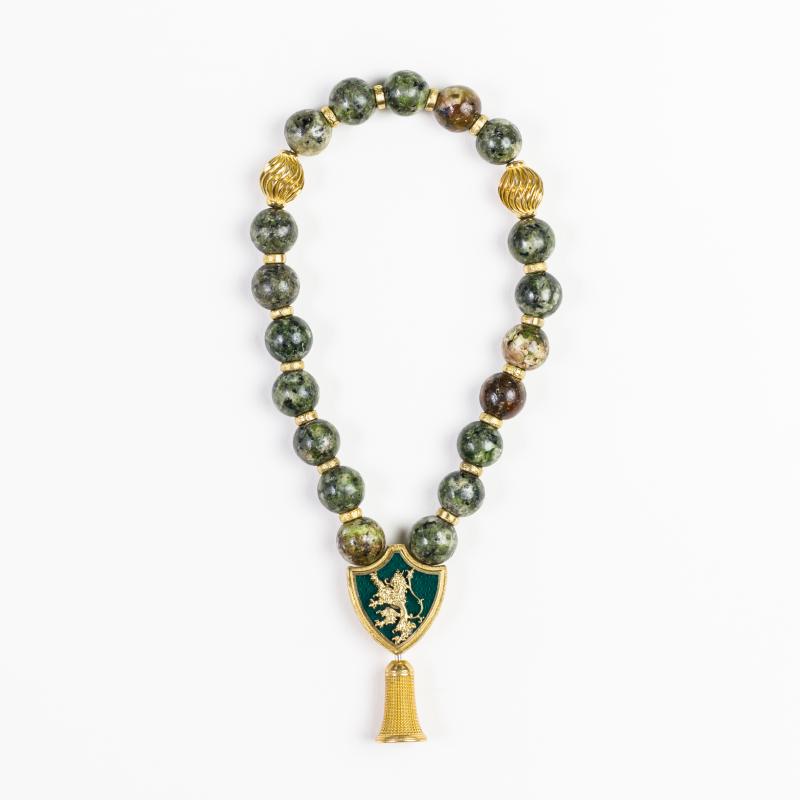Նյութը՝ ոսկերչական ալոյ, կերամիկական էմալ, բնական քար, ոսկեպատՔաշը՝ 50 գՉափը՝ 160 մմՊատրաստման եղանակը՝ ձեռքի աշխատանք
